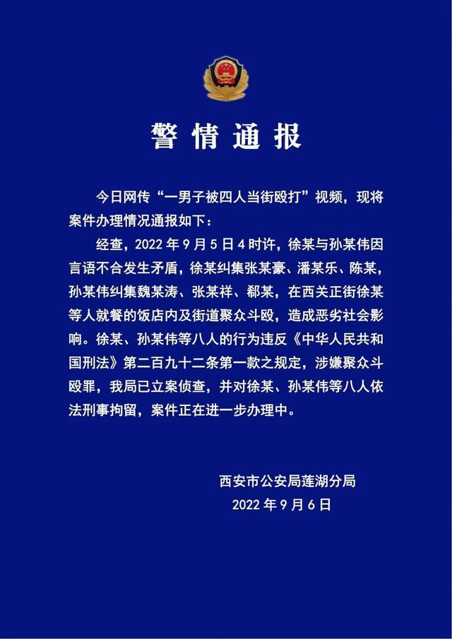通报称,经查,2022年9月5日4时许,徐某与孙某伟因言语不合发生矛盾,徐某纠集张某豪、潘某乐、陈某,孙某伟纠集魏某涛、张某祥、郗某,在西关正街徐某等人就餐的饭店内及街道聚众斗殴,造成恶劣社会影响。徐某、孙某伟等八人的行为违反《中华人民共和国刑法》第二百九十二条第一款之规定,涉嫌聚众斗殴罪,我局已立案侦查,并对徐某、孙某伟等八人依法刑事拘留,案件正在进一步办理中。