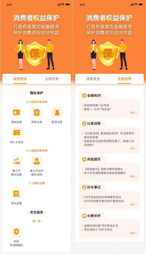 活动期间,平安健康保险在官方客户端平安健康保险及微信小程序平安健康保险上线消费者权益保护专区——权益保护;在平安健康险官网升级消费者权益保护专区——金融知识教育,设立金融知识普及月专栏。同时,在“金融知识”、“ 以案说险”、“ 风险提示”、“ 历年事记”和“长辈关怀” 专栏发布本次活动宣教资料;在“隐私保护”专栏发布个人信息收集清单、个人信息共享清单及隐私政策;在“安全服务”专栏上线“你的在线防骗性”答题通关小游戏。通过权益保护专区,提高消费者权益保护意识,提升消费者理性投资理念。