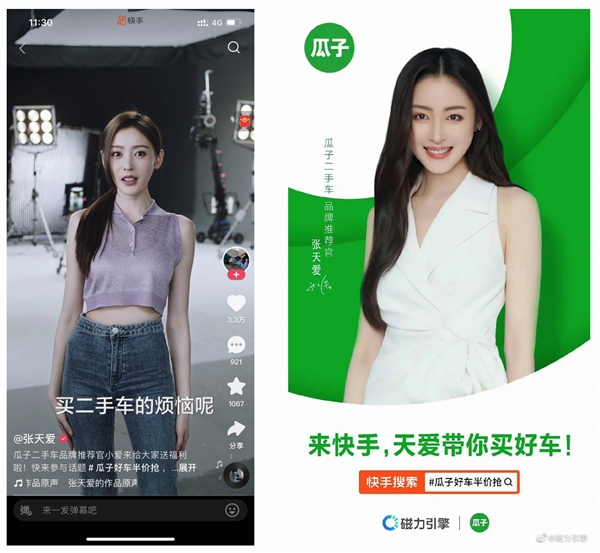 为此,快手邀来张天爱担任瓜子二手车品牌推荐官,以明星影响力为活动打call。张天爱不仅以vlog方式讲述购买二手车烦恼,亲切安利瓜子好车节,还化身shopping时尚女神、汽车检测师和理财师三重角色具象演绎瓜子车多、车好、车便宜的卖点。