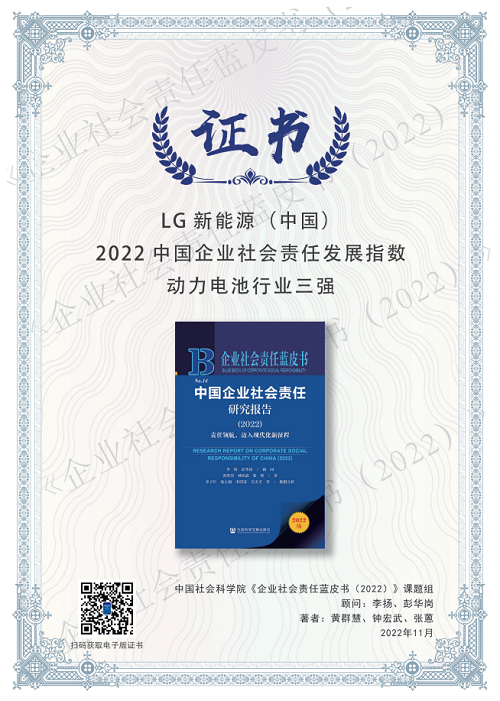 《企业社会责任蓝皮书》由中国社会科学院社会责任研究中心编制,是目前中国企业社会责任领域最具影响力的研究成果。“企业社会责任发展指数(2022)”基于“通用指标+行业特色指标”评价体系,以企业性质、所在行业为划分标准,对企业社会责任信息进行内容及定量分析的指数评价。LG新能源在绿色管理、绿色生产、绿色运营的环境责任版块,伙伴、员工、社区的社会责任版块,责任管理的责任融合版块,以及本质责任的客户责任板块摘取八项最高评分,总评分名列榜首。此次排名的蝉联及奖项的殊荣,既是对LG新能源在社会责任领域取得成效的有利认可,也是对LG新能源作为动力电池行业的领军企业,在可持续发展和绿色产能方面做出贡献的肯定。