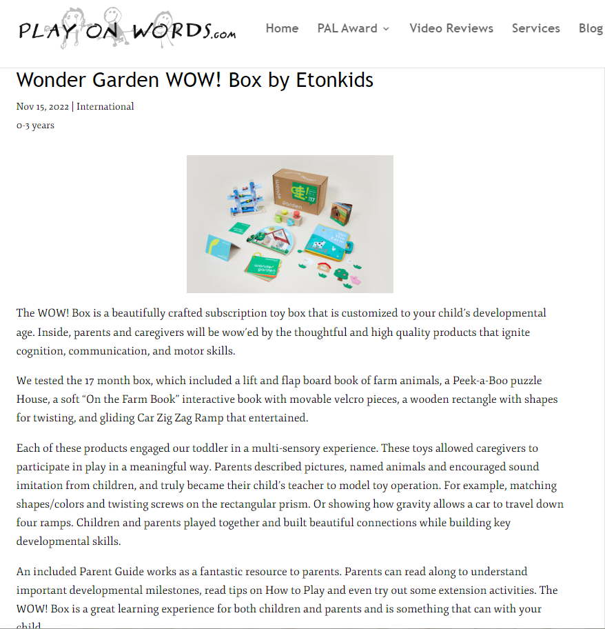 为保证PAL奖项的权威性和科学性,PAL会对每一款提名的产品进行实测,本次PAL评委会对哇盒子17月龄盒产品进行了全方位测评。评委会认为,哇盒子是一款制作精美、能给父母带来震撼的高质量月龄产品,里面的每一个玩具都能带给孩子多重感官体验,激发他们的认知、沟通和运动技能。附赠的《家长指导手册》能帮助家长了解孩子重要的发展里程碑,学会作为观察者如何和孩子有效互动。在这个过程中,不仅可以提升家庭亲子关系,还能促进孩子该成长阶段的语言发展和其他关键技能的发展。