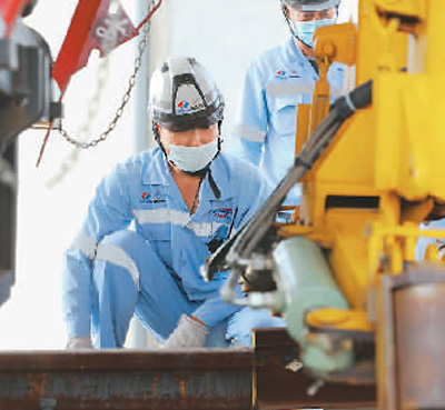 7月1日,在印度尼西亚万隆,工人在雅万高铁正线有砟轨道铺设施工现场作业。 |