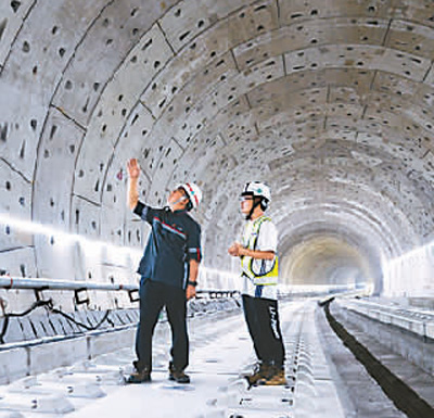 5月9日,印尼中国高速铁路有限公司工作人员在雅万高铁1号隧道内查看施工情况。 |