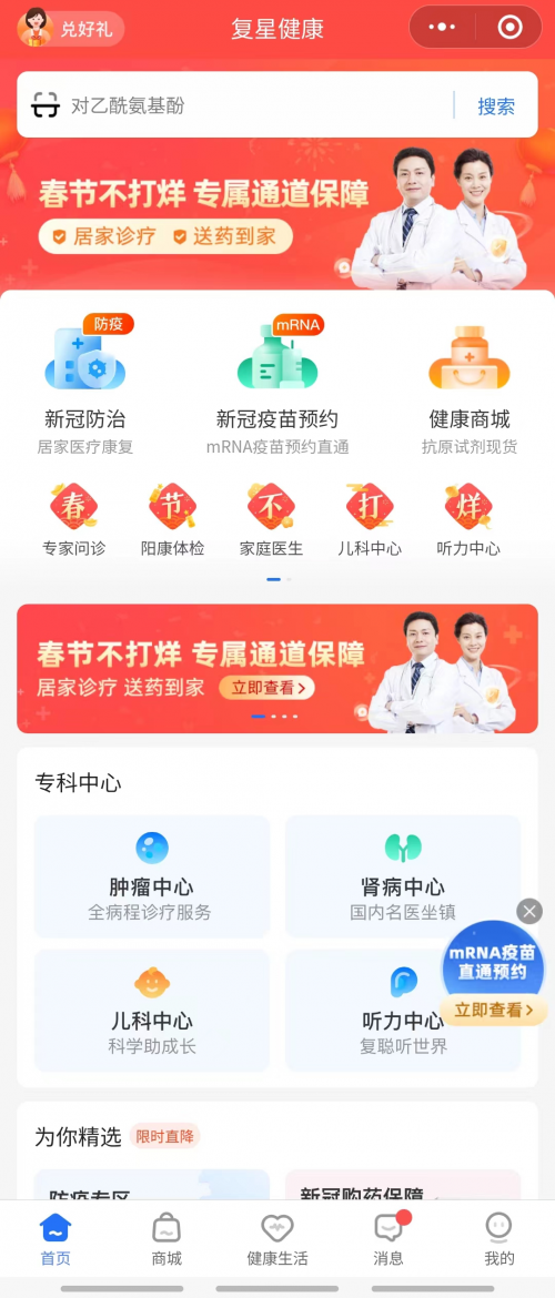 目前,阿兹夫定已覆盖全国主要医疗机构,以及开通互联网医院问诊处方渠道,方便百姓就医用药。患者可通过复星健康APP或小程序在线处方阿兹夫定,每人限购2瓶,下单后2天左右即可寄送到家。据了解,为积极应对春节期间的感染高峰,复星健康已经做了相应的准备工作。春节期间,复星健康互联网医院的医生持续为患者提供在线诊疗服务,平台也围绕产供储送全链条,全力保障患者就医送药的稳定性和及时性。