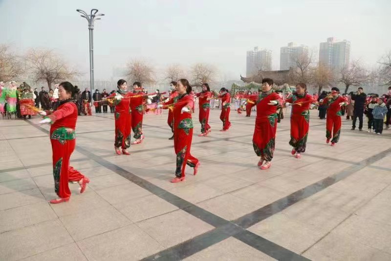 欢快的锣鼓响起来,喜庆的秧歌扭起来。在凤凰湖广场展演现场,舞龙、霸王鞭、扭秧歌、踩高跷、划旱船、盘鼓等一个个精彩的节目轮番上演,营造了浓厚的新春喜庆氛围。其中,素有“武术之乡”和“民间舞蹈之乡”的城郊乡汤庙村民表演的民间艺术霸王鞭,属于市级非物质文化遗产,是自楚霸王而始的一种传统舞蹈,又集武术和艺术于一体,该舞蹈奔放粗犷、干净利落、潇洒大方,板鞭流畅,展现了人们对幸福生活的向往,闪烁着人民群众智慧的光芒。