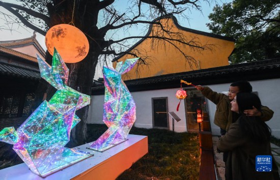 1月29日,在嘉兴市秀洲区新塍古镇小蓬莱公园内,游客在观赏“鳌山灯会”的兔子彩灯。