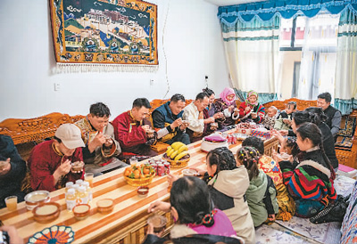 2月19日是藏历十二月二十九,也是一年一度的“古突”夜,藏族群众家家户户吃“古突”(一种用牦牛肉汤加入牛肉、萝卜、奶渣等食材熬煮的面食),迎接藏历新年。来自西藏自治区那曲市双湖县的搬迁群众石秀次仁一家,在位于山南市贡嘎县森布日安置点迎来了搬家后的第一个“古突”夜。图为石秀次仁一家正在吃“古突”。