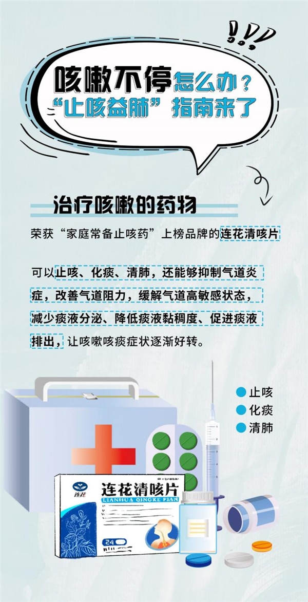 指南建议三:“止咳益肺”,对症用药。当出现咳嗽、咳黄痰时,可以使用连花清咳片等中成药,有效减少痰液的产生,降低痰液粘稠度,促进病毒或细菌感染的排出。随着痰液的不断排出,咳嗽症状也就会逐渐消退。