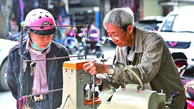 在广西钦州老街,一位老师傅在给市民配钥匙。新华社发