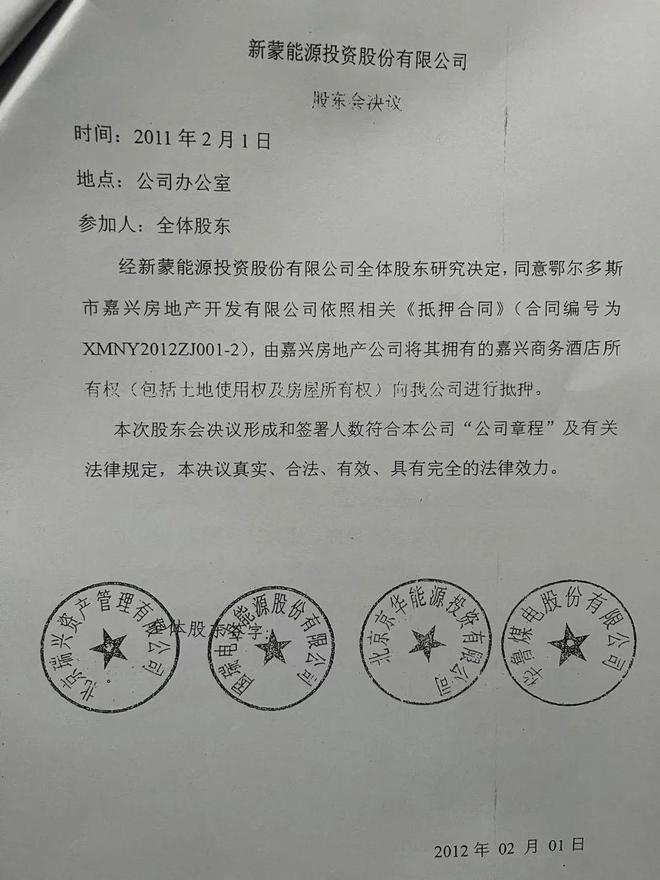“经新蒙能源投资股份有限公司全体股东研究决定,同意鄂尔多斯市嘉兴房地产开发有限公司依照相关《抵押合同》(合同编号为XMNY2012ZJ001-2),由嘉兴房地产公司将其拥有的嘉兴商务酒店所有权(包括土地使用权及房屋所有权)向我公司进行抵押。本次股东会决议形成和签署人数符合本公司“公司章程”及有关法律规定,本决议真实、合法、有效、具有完全的法律效力。”