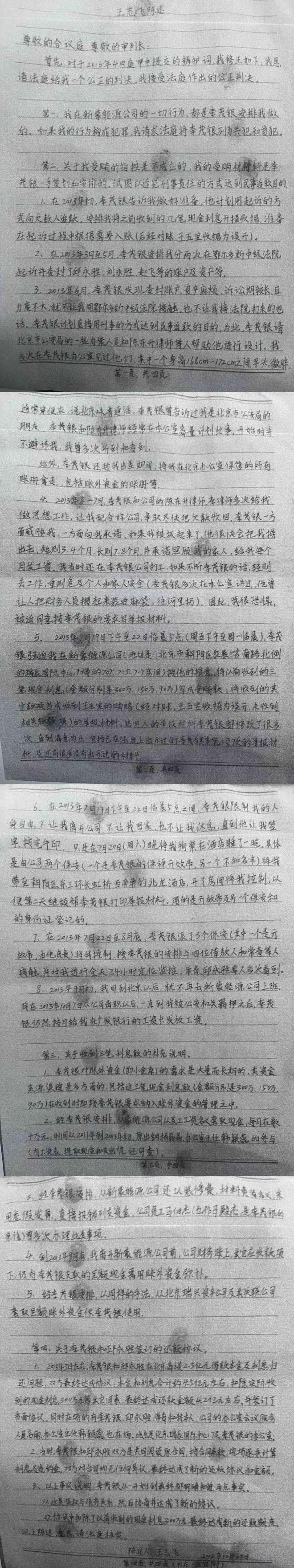 “2015年7月19日下午至22日凌晨5点,李茂银强迫我在新蒙能源公司按他的授意,将以前收到的三笔现金利息(金额分别是300万、150万、90万)写成受贿款……限制我的人身自由,不让我离开公司,不让我回家,也不让我休息,直到他让我签字接完手印,只是在7月20日晚将我拘禁在酒店睡了一晚。”