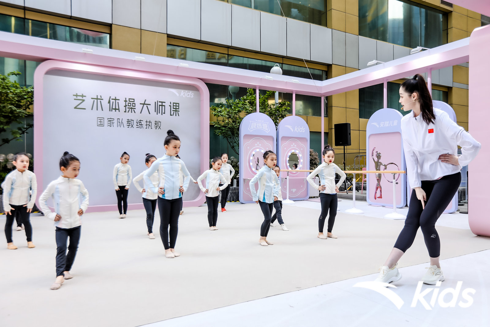 3月31日-至4月2日,中国艺术体操国家队教练金珂冰现身南京“艺术体操大师课”。在以粉红为主基调的训练场地中,她带领一众艺术体操学员和安踏儿童小会员,在现场进行专业训练,包括柔韧训练、器械训练、地面基本功训练、专项素质训练等,淋漓尽致地展示了艺术体操独特的力与美的魅力。
