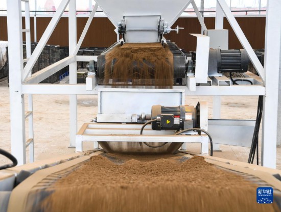 4月20日,在彭山区公义镇,智能水稻育秧播种流水线上的上土机通过感应装置添加培土。