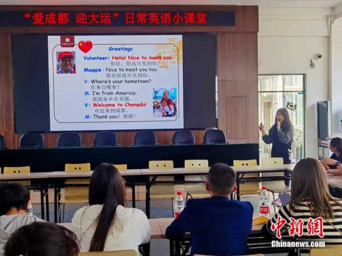 为帮助居民打通“语言关”,成都市武侯区金花桥街道金花社区联合金花中学开展“我和大运有个约会”日常英语小课堂活动。课程内容包括与外国友人打招呼、自我介绍、指路及赛事关键词、大运会标语、口号等,掀起全民学习热潮。