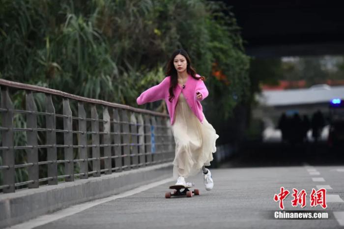 “闪光少女”胡月正在滑滑板。张浪 摄