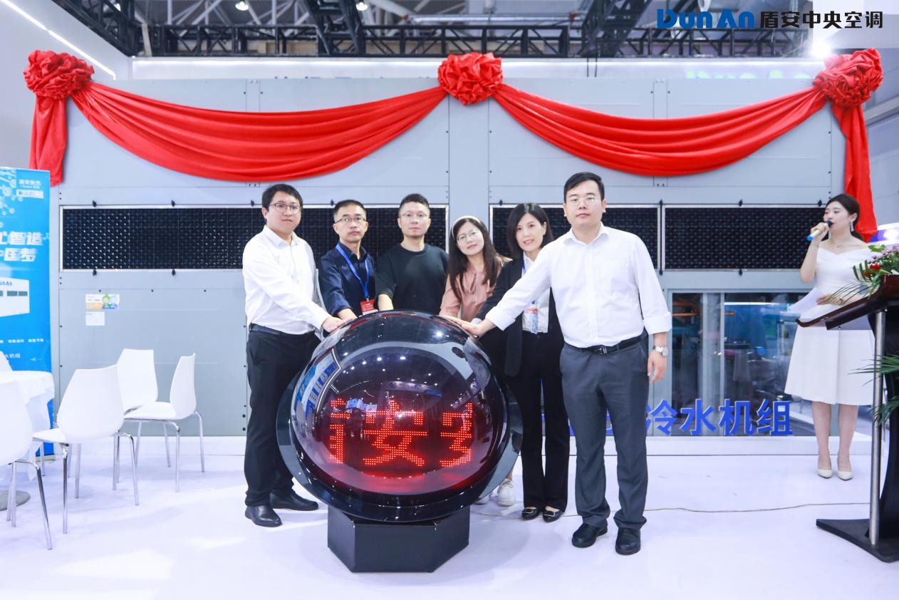 现场迎来了本场发布会最重要的一个环节——盾安安杰i-Super系列蒸发冷一体式冷水机组新品发布仪式。江苏省医药设计院暖通技术总工秦浩斌、山东省医药设计院暖通技术总工姜宇、江苏省医药设计院南京分院暖通技术总工黄凤苗、盾安中央空调技术总监史俊茹、营销区域总监宋昌顺、市场总监王光友共同按下启动球,盾安安杰i-Super系列蒸发冷一体式冷水机组新品隆重发布。