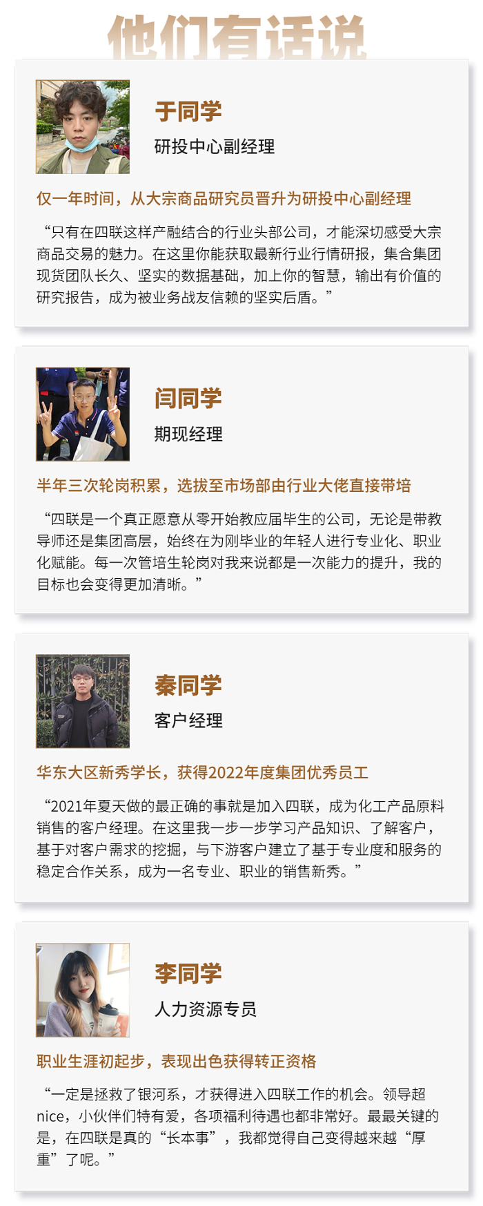 在实现经济效益增长的同时,四联创业集团为员工创造更多成长空间。集团设立了丰富多样的员工能力提升项目,如管培生招聘与轮岗、导师带教、内部竞聘、跨区域调动、产品经理期货知识与应用专项提升、产融培训等。在实现集团高速发展的同时,带动员工实现职业梦想,见证员工职业成长。员工稳定是员工与企业共同成长的主要要素之一,四联创业集团3年及以上资深员工占75%以上。