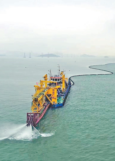 专用清淤船正在进行隧道基槽挖掘。 |