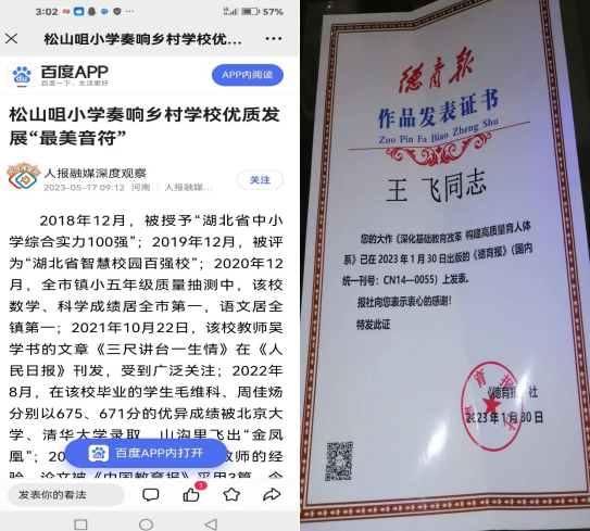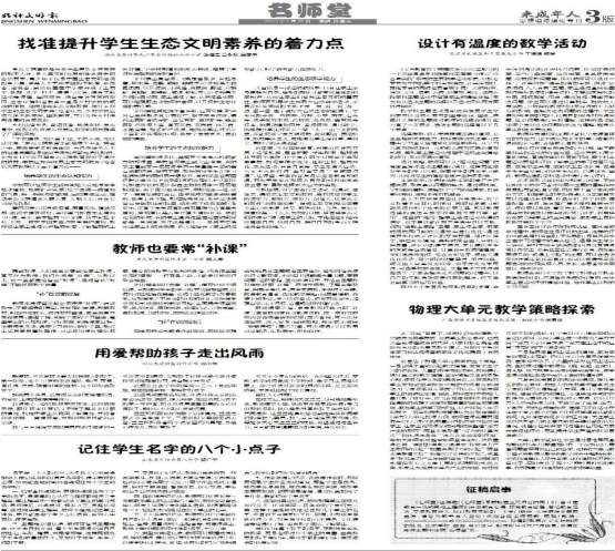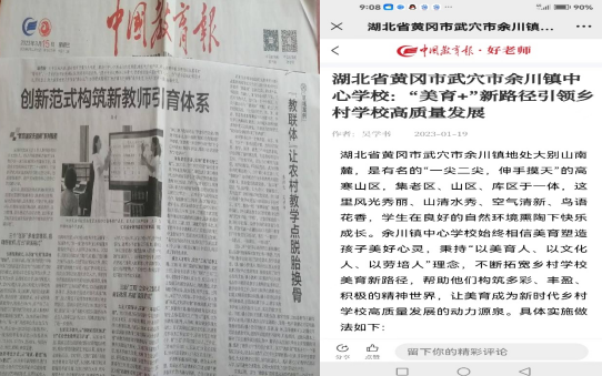今年以来,地处山区的湖北省武穴市余川镇松山咀小学陆续3次收到从北京中国教育报传来的消息:1月19日,该校教师吴学书采写的《“美育+”新路径引领乡村学校高质量发展》一文在中国教育报“以美育人向美而行”优秀美育创新案例征文中采用;3月15日,校长张维生撰写的《“教联体”让农村教学点脱胎换骨》文章被刊用;4月21日,校长张维生等教师的文章《找准提升学生生态文明素养着力点》被刊登。一所乡村小学在不到半年的时间里3次在《中国教育报》上发表文章,令人刮目相看,受到广泛关注。