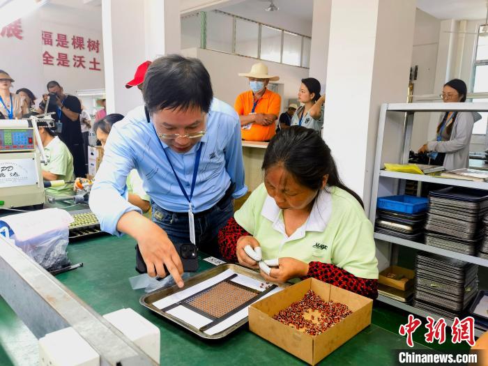 6月28日,太安社区搬迁民众在帮扶车间接受海外华文媒体代表采访。