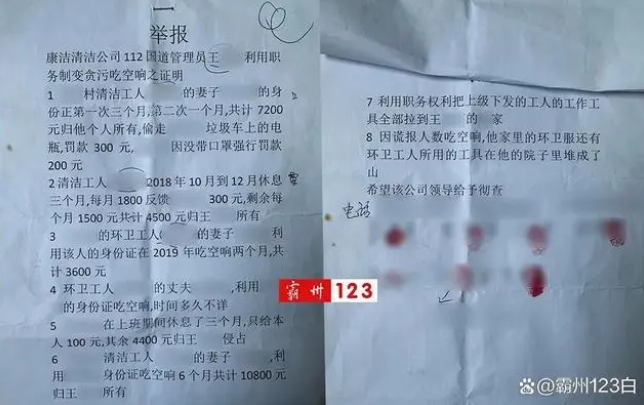 据霸州康洁公司知情环卫工说,我们是康洁公司的环卫工,负责112国道的卫生清运,我们一共有七八个人,我们片区原来有位负责班长王某,负责日常的管理,我们就是要举报他,利用职务之便,“贪污”、“吃空响”。