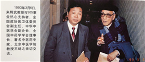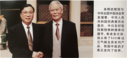 中日友好医院专家室副主任、国家中医药管理局、中华全国中医学会常务理事、中华全国中医学会、中华人民共和国药典委员会委员、国家卫生部药品审评委员会委员、北京中医学院名誉教授焦树德教授为来辉武题词:“精研岐黄,为人类健康做贡献”。并在许多场合深有感慨地讲:“自从有了505神功元气袋及系列产品,中医药才真正地走向了世界!”