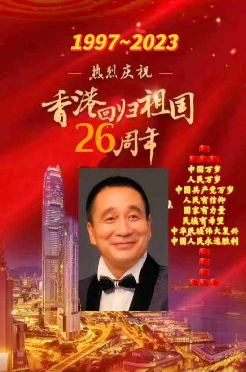 1997年7月1日应邀参加情系香江、血脉相连,华侨华人与香港回归庆典活动。来自35个国家和地区的300余名海外华侨华人代表出席交接仪式及庆典活动,其中包括著名科学家杨振宁、袁家骝、丘成桐,著名企业家林绍良、谢国民、陈永栽、庄锡鸿、林文镜,著名侨领唐裕、陈焜旺、陈济明、胡志光,孙中山先生孙女孙穗芳、陈嘉庚先生之孙陈立人等名人之后也在受邀之列。
