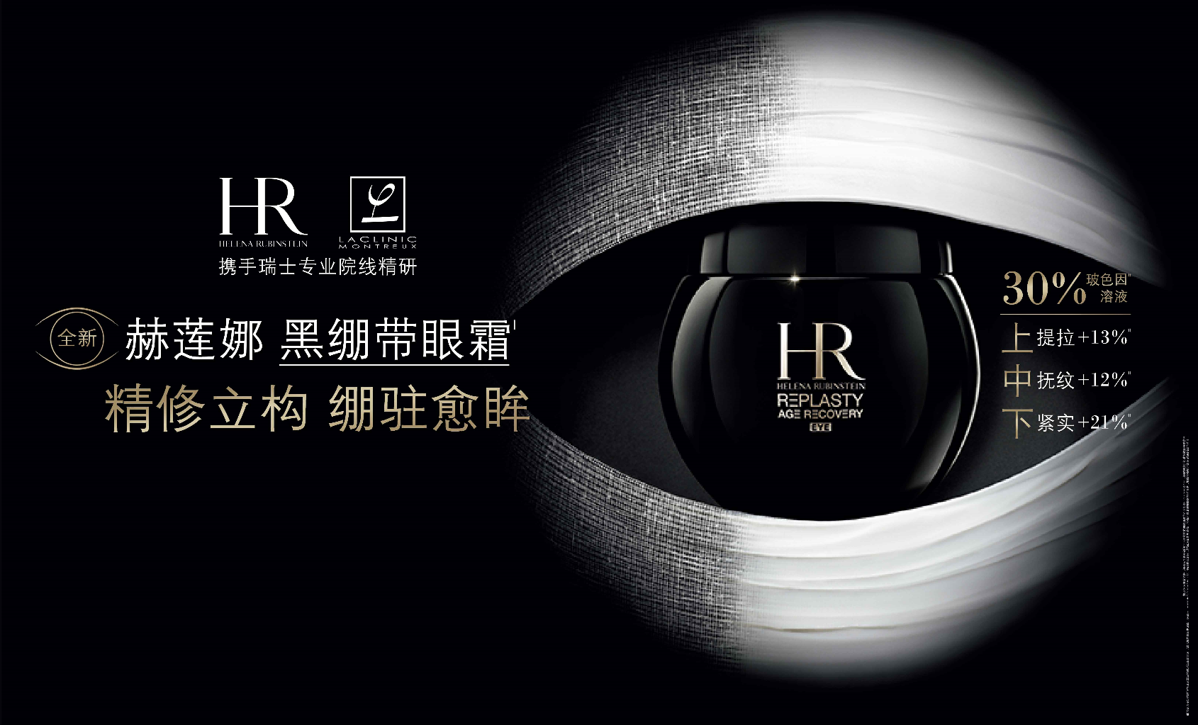 百年奢美护肤品牌HR赫莲娜坚守尖端科技、不断开拓前沿美容疆土。再度联合瑞士蒙特勒高端肌肤抗老机构LACLINIC-MONTREUX,基于特殊美容项目专研的全新眼部绷带力作——黑绷带眼霜首次在国内重磅亮相,革新突破性的眼周修护式抗老理念,攻克眼周护理难题。