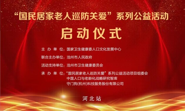 2023年7月29日由国家卫生健康委人口文化发展中心主办;沧州市人民政府联合主办;“国民居家老人巡防关爱系列公益活动组委会、”中国人口与老龄化战略研究智库与守门狗(杭州)科技服务股份有限公司共同承办的“国民居家老人巡访关爱”系列公益活动(河北站)启动仪式活动,在沧州市阿尔卡迪亚酒店举行。