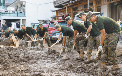 8月8日,武警河北总队保定支队组织突击队在河北省涞水县清理淤泥。 |
