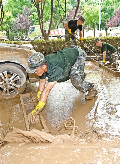 8月6日,河北省涿州市腾飞大街,武警河北总队机动支队官兵清理道路淤泥。 |