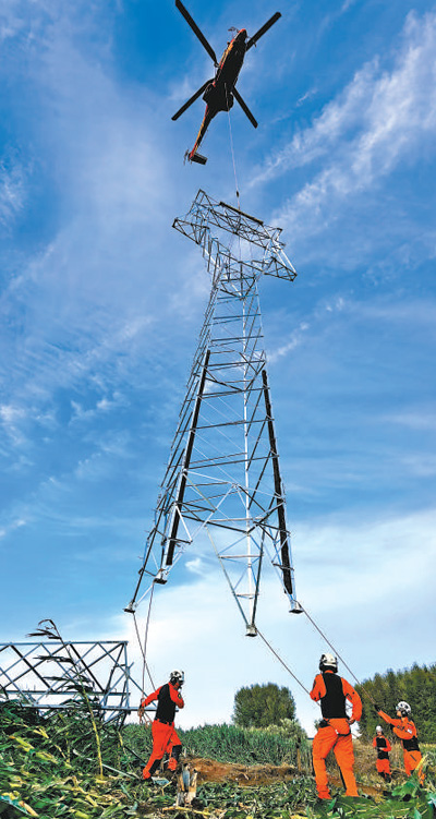 8月9日,国家电网公司调配直升机支援黑龙江电力恢复工作。图为直升机在牡丹江海林110千伏海长线抢修现场整塔吊装作业中。 |