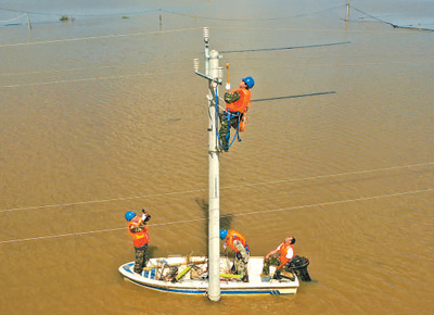 8月9日,国网长春供电公司抢修人员在吉林省榆树市怀家12组进行作业,为受灾群众恢复生活用电。 |