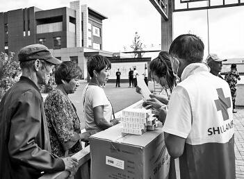 为应对台风“卡努”带来的影响,吉林省舒兰市落实转移关停措施,确保危险区域群众应转尽转、应转必转、应转早转,全力保障人民群众生命安全。图为8月11日,居民在舒兰市舒兰三中居民安置点领取舒兰市红十字会发放的药品物资。新华社记者 颜麟蕴摄