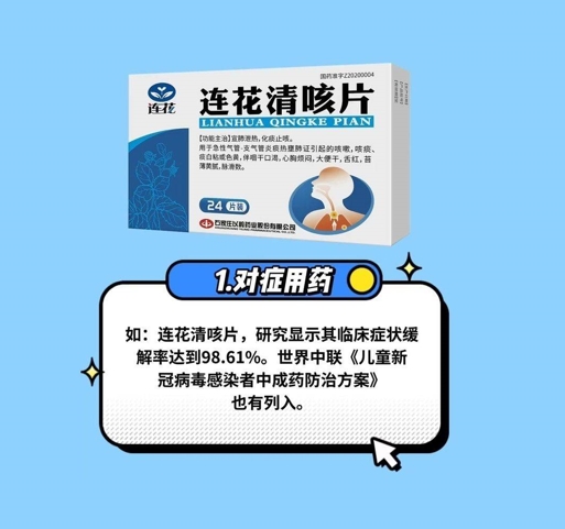 1、对症用药。《新冠病毒感染者居家中医药干预指引》中提到,症见咽痛明显、发热、肌肉酸痛、乏力或咳嗽者,宜服用具有疏风清热,化湿解表、清热解毒功效的中成药如连花清咳片等,此外,十余省市的新冠中医药诊疗方案及居家指引也推荐使用连花清咳片治疗。研究显示,其临床症状缓解率达到98.61%。世界中联《儿童新冠病毒感染者中成药防治方案》也有列入。连花清咳片具有“快速止咳,清肺化痰”的作用特点,组方融汇东汉张仲景《麻杏石甘汤》宣肺泄热,明代叶文龄《清金化痰汤》清热化痰,可缓解气道内炎症、保护气道黏膜、减少痰液生成,有效改善新冠所致的咳嗽咳痰症状。