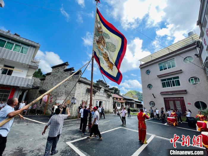 “村课”现场,岭干村村民进行“迎大旗”民俗表演。 张斌 摄