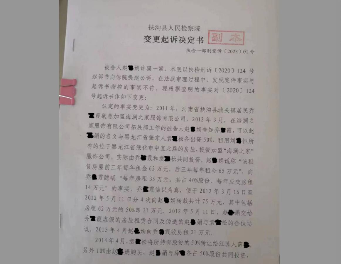 扶沟县法院对赵某娟做出的一审判决被周口市中级法院撤销发回重审后,扶沟县检察院针对此案,再次做出了变更起诉决定书。这次认定赵某娟骗取乔某霞房款105033元。