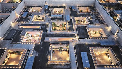 这座“戏剧幻城”从盲盒中创意取材,用夯土城墙合围出方正的空间,并划分出56个完全不同的格子,打造了21个剧场和不同风格的景观院落。游客可以在格子中穿行,分别进入不同时期、不同主题的戏剧空间观演。置身其中,在LED光影技术、“声光电画”一体化数控系统的辅助下,游客可以回到红庙学校,重温童年时的课堂时光;“穿越”到1942年,体验李家村人逃荒的艰辛;来到“天子驾六遗址坑”与想要预见未来的周天子进行“时空对话”……