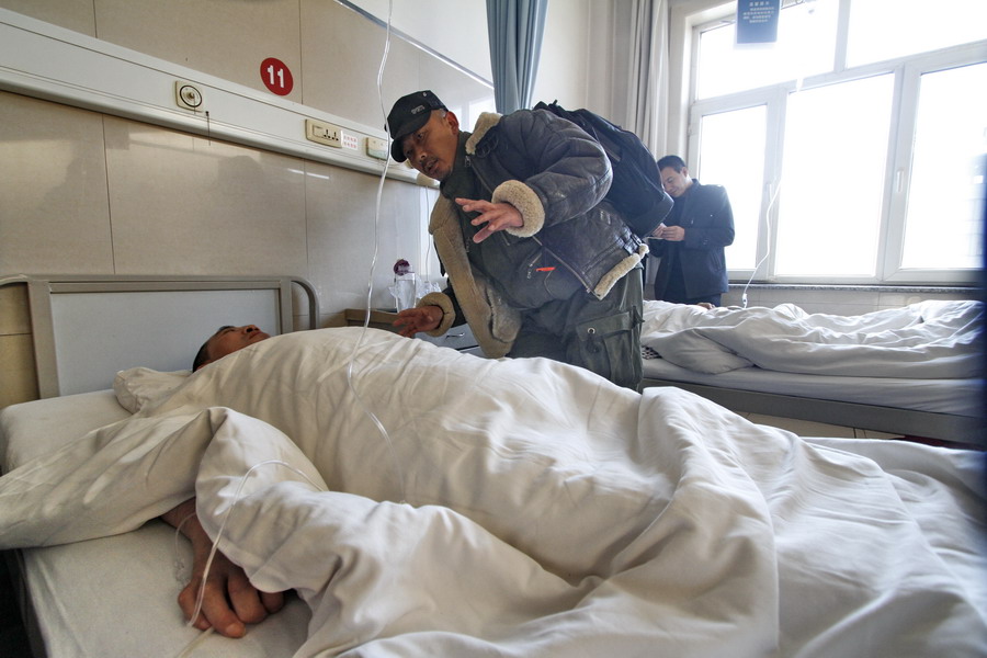 来自内蒙古宁城县存金沟乡南山根村的农民工张义良,在位于郑州西郊的153医院的病床上已经瘫床几个月了。住院后经过了部队医院医生高水平医术的手术治疗,虽然命是保住了,可是这整天的躺在床上也不是事呀。现在张义良除了脖子以上的部分有知觉外,几乎全身瘫痪了,拉撒都是没有自控能力,事故发生后,所在项目工程方除了开始救治的时候来过之后,除了侄子张云亮索要,给支付医药费外,既不见面又不给生活补助,他们公司也没办法,就是垫付的医药费也是经常不及时支付,闹得医院经常停药。这让来这里伺候老张的妻子很是惶惶不可终日。“来的时候,说得好好的,管吃管住还有保障安全。可是来了没多久就成了这样一个瘫子了,谁来管我们一家人以后的生活呀?”