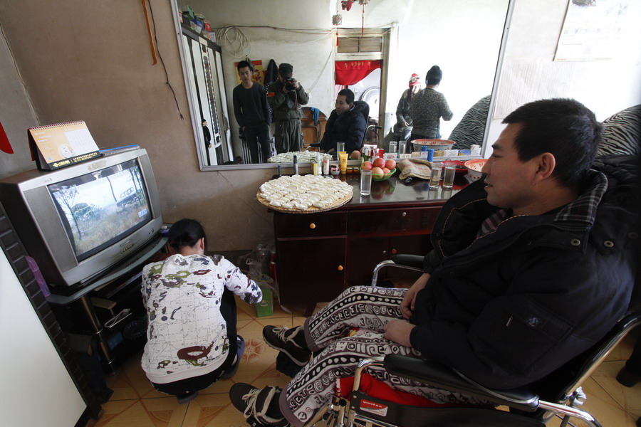 孩子们在忙着找茶叶,张义良则是一边欣赏着电视,享受着家的味道。