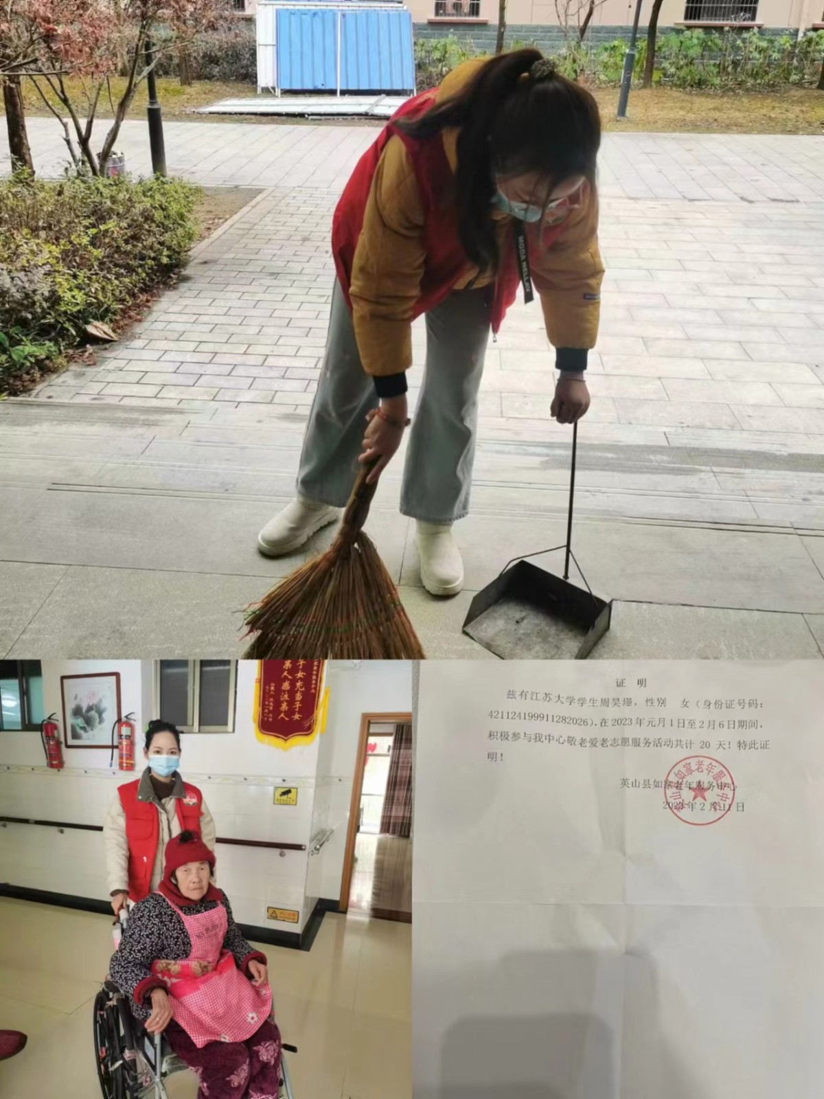 2023年元月1日至2月6日期间,江苏大学学生周昊璟积极参与英山县如家老年服务中心20天,表现出了令人钦佩的社会责任感和热情,积极参与志愿活动,为社区和社会贡献了自己的一份力量,受到当地群众的好评。