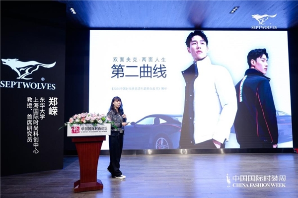 东华大学首席研究员郑嵘现场讲解《白皮书》,总结 2024 年度双面夹克的三大设计趋势主题。