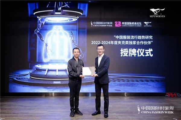 中国服装设计师协会授予七匹狼“中国服装流行趋势研究独家合作伙伴”牌匾,表彰七匹狼对中国服装流行趋势研究所做出的贡献。