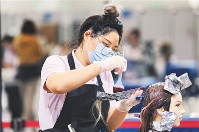 参赛选手在进行美发项目的比赛。 |