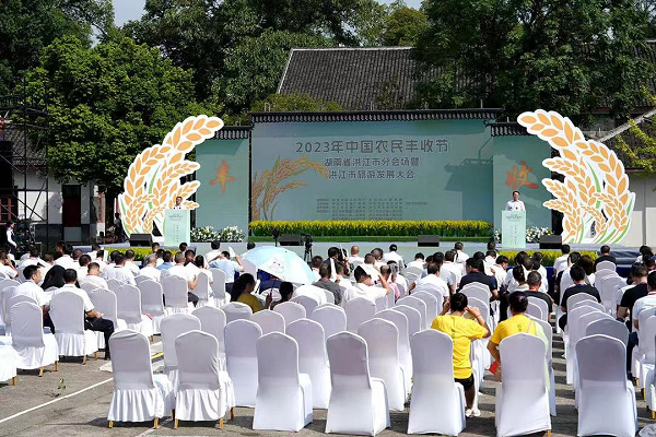 9月20日,2023中国农民丰收节湖南省洪江市分会场暨洪江市旅游发展大会等系列活动在洪江市安江农校纪念园举行。湖南省农业农村厅二级巡视员李立平,怀化市政协副主席肖莉杏等省、怀化市领导及洪江市市委书记郑小胡,市委副书记、市长向青松等出席。丰收节在以农耕文化为主题的文艺演出中拉开帷幕,丰富多彩歌舞节目让嘉宾们和游客领略了洪江市独特的春耕、播种、丰收等农耕真实生产生活场景,充分感受到千年农耕文明魅力。随后嘉宾和当地农民朋友们参加健康跑、浏览稻香集市,参加农耕运动会,置身稻香深处,触摸着中国农业波澜壮阔的脉动,体会丰收的喜悦。乡间田野新风光,稻香集市好“丰”景。安江镇又被称为“物种变异天堂”,独特的地理环境孕育了这里丰富的物种资源。稻香集市上集合了当地农特产品,黔阳冰糖橙、安江香柚、安江脐橙、安江金秋梨等等,洪江特产誉满神州,香飘四海。