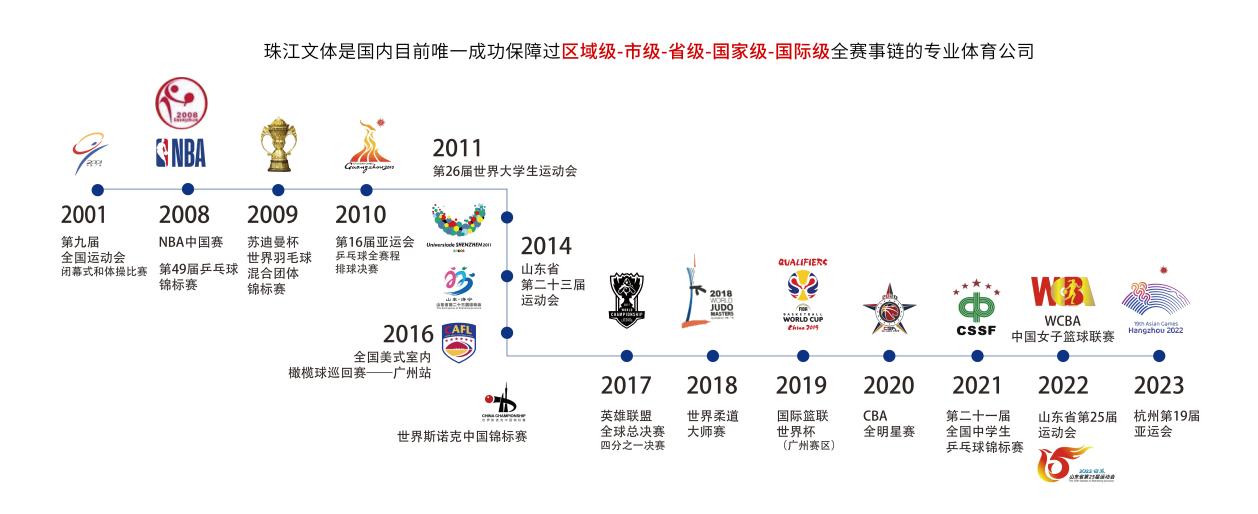 2010年至2023年,从珠江奔流到钱塘潮涌,卓绝的亚运精神生生不息。有序高效的赛事保障背后,离不开珠江文体多年来从一次次国际级、国家级的重大赛事积累下的“实战经验”。珠江文体是国内目前为数不多成功保障过世界级、亚洲级、国家级、省市级全赛事链的专业公司,凭借多年努力,珠江文体在体育产业方面所获成果得到了省级和国家级体育行政部门的认可和社会各界的肯定,入选2021年广州市“体育与健身产业链”链主企业,获评2022年国家体育产业示范单位和广东省体育产业示范单位。