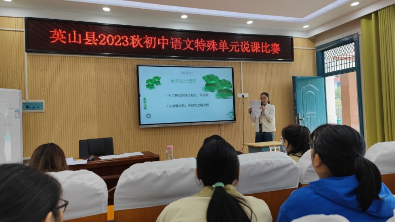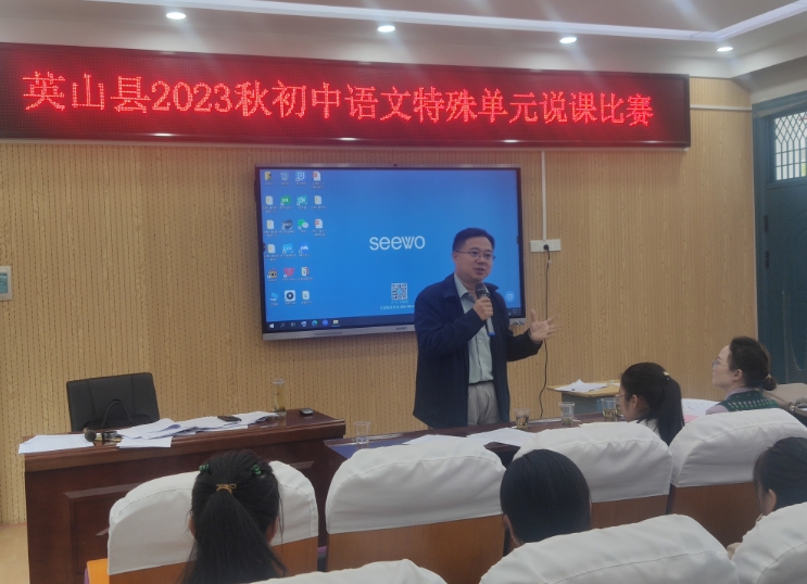 为落实2022版《义务教育语文新课程标准》要求,进一步研究课程标准与教材之间的关系,树立用好部编语文新教材导向,2023年10月13日,英山县教科院在思源学校金铺校区举行初中语文特殊单元说课比赛活动,思源学校胡百泉书记、徐盛校长到会观摩指导。