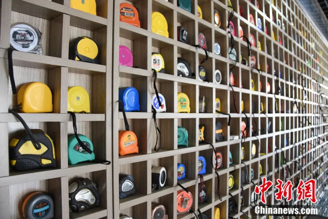 稍岗镇一家企业的钢卷尺展示墙。王宇 摄