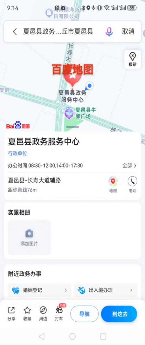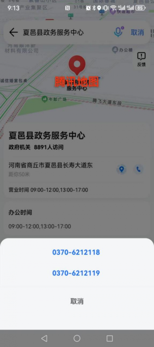 近日,夏邑县行政审批和政务信息管理局将政务服务中心办公地点、办公电话,在百度地图、腾讯地图、高德地图主流导航地图上进行了规范标注。打开导航地图,搜索夏邑县政务服务中心时,可以第一时间看到联系电话,通过拨打电话轻松实现“一次告知”“首问负责”,为便企利民打开了一扇新的窗口。