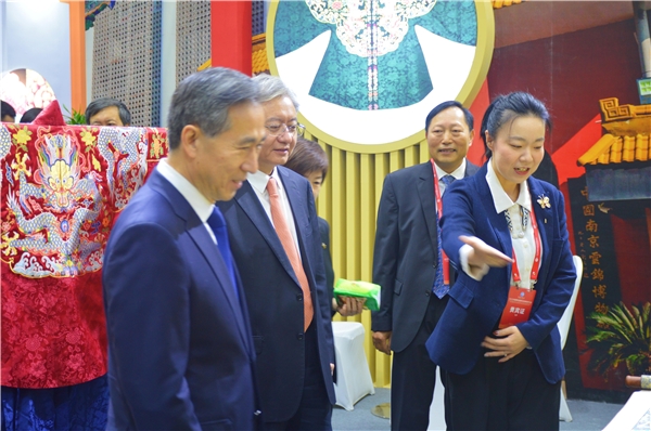 展会伊始,中国国际贸促会会长任鸿彬、国家知识产权局副局长卢鹏起,特别莅临云锦研究所独立展区,了解南京云锦精品化成果,并对云锦现代化作品详细了解。任会长更直接指出这是江宁织造的传承典范。